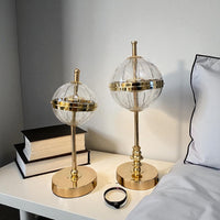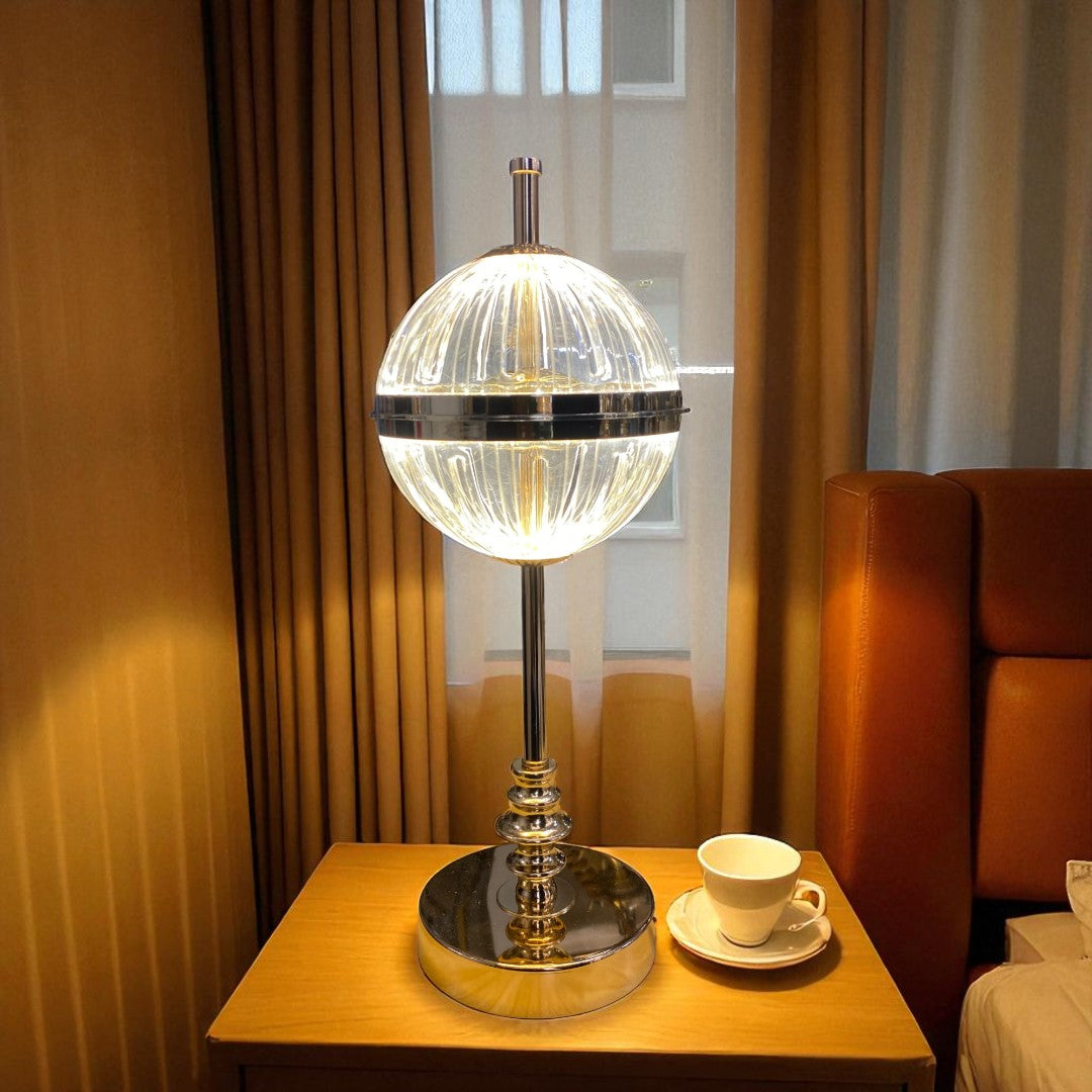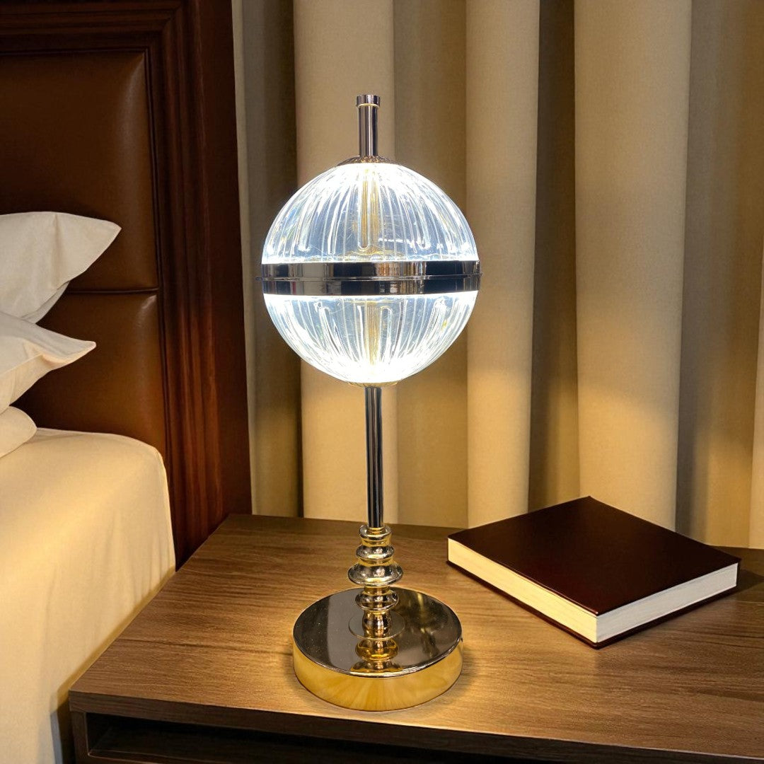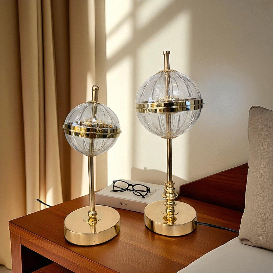 This striking pair of table lamps combines modern artistry with timeless elegance. Featuring spherical crystal glass shades with intricate patterns, encased in a gleaming gold-toned metal band, the design evokes a celestial-inspired aesthetic. The sturdy gold-finished base and sleek stand provide stability and a luxurious touch, while the warm glow of light radiates through the textured glass for a refined ambiance. Perfect for living rooms, bedrooms, or entryways, this lamp set makes a bold statement as both a functional lighting source and a decorative centerpiece.