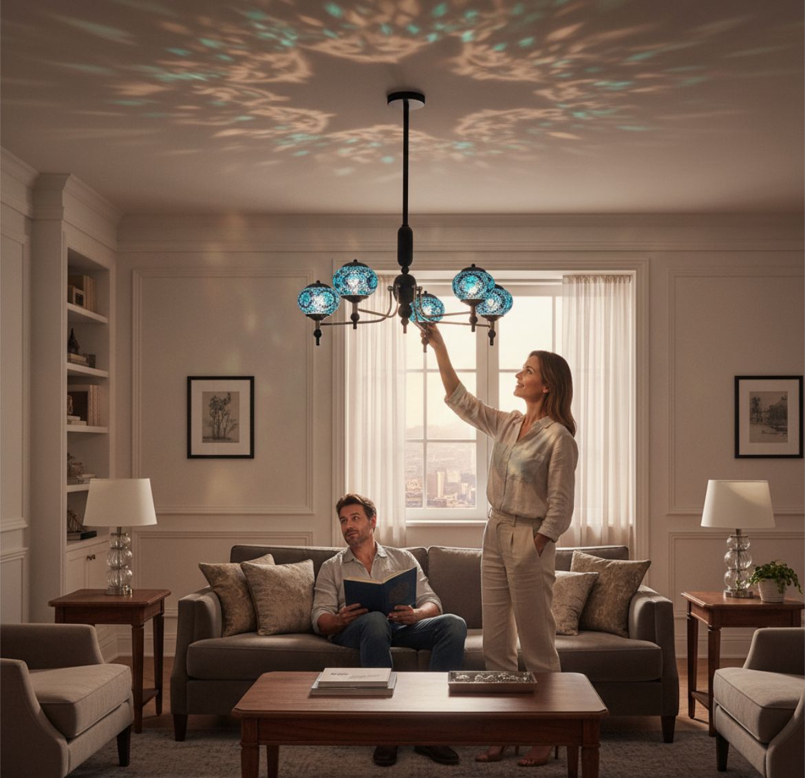 The Celeste Mosaic Glow Chandelier brings a vibrant touch of artistry and modern charm to any space. Its sleek metallic frame extends gracefully, holding six hand-crafted mosaic glass globes in shades of deep blue, turquoise, and hints of violet. Each globe radiates a dazzling play of colors, creating a captivating ambiance when illuminated.