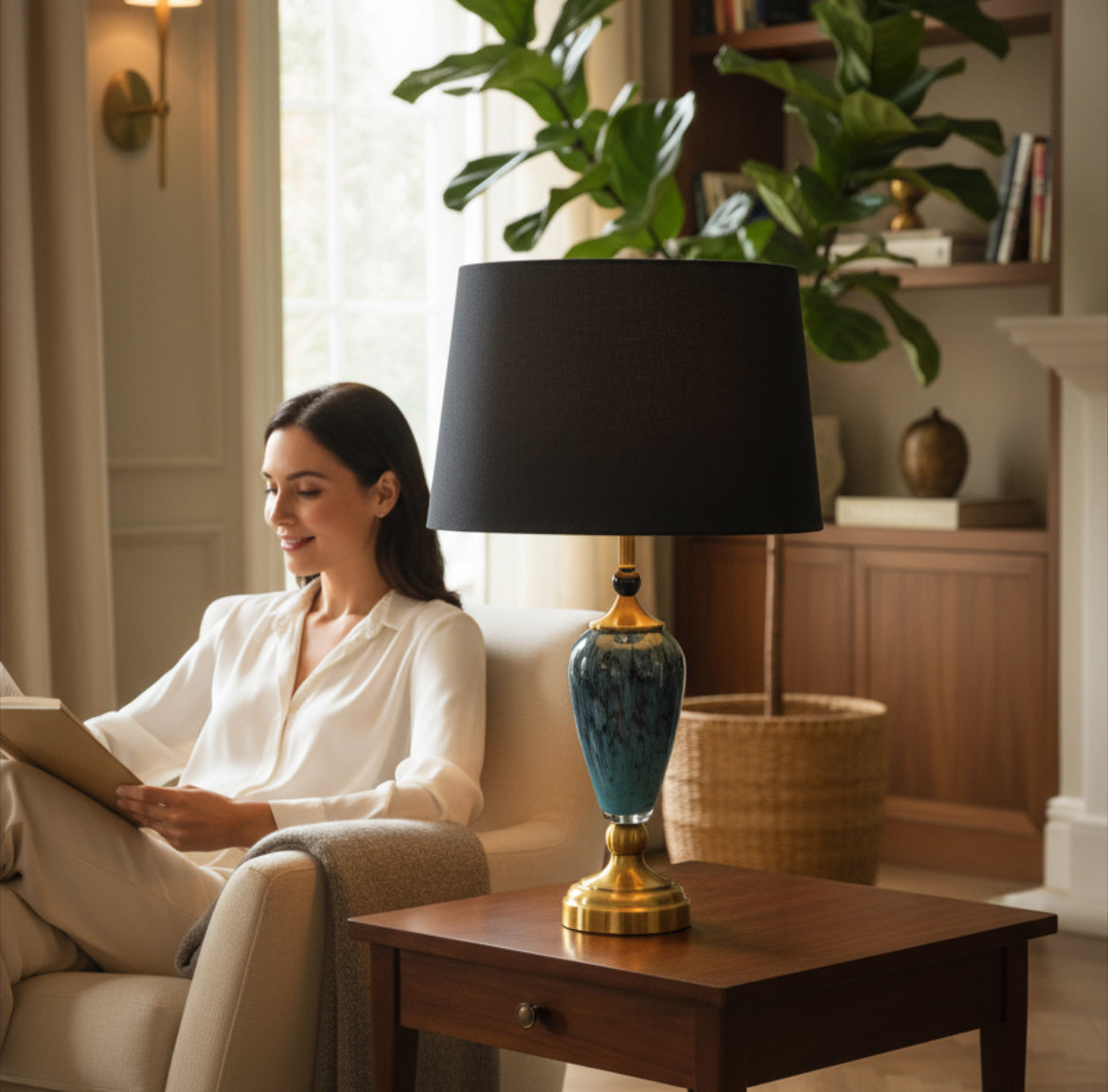 This luxurious table lamp combines artistic craftsmanship with timeless elegance. It features a glossy blue ceramic base with intricate gradient detailing, paired with brass-finished accents on the pedestal and neck for a refined touch. The design is completed with a black fabric drum lampshade, offering a bold contrast that enhances its visual appeal.