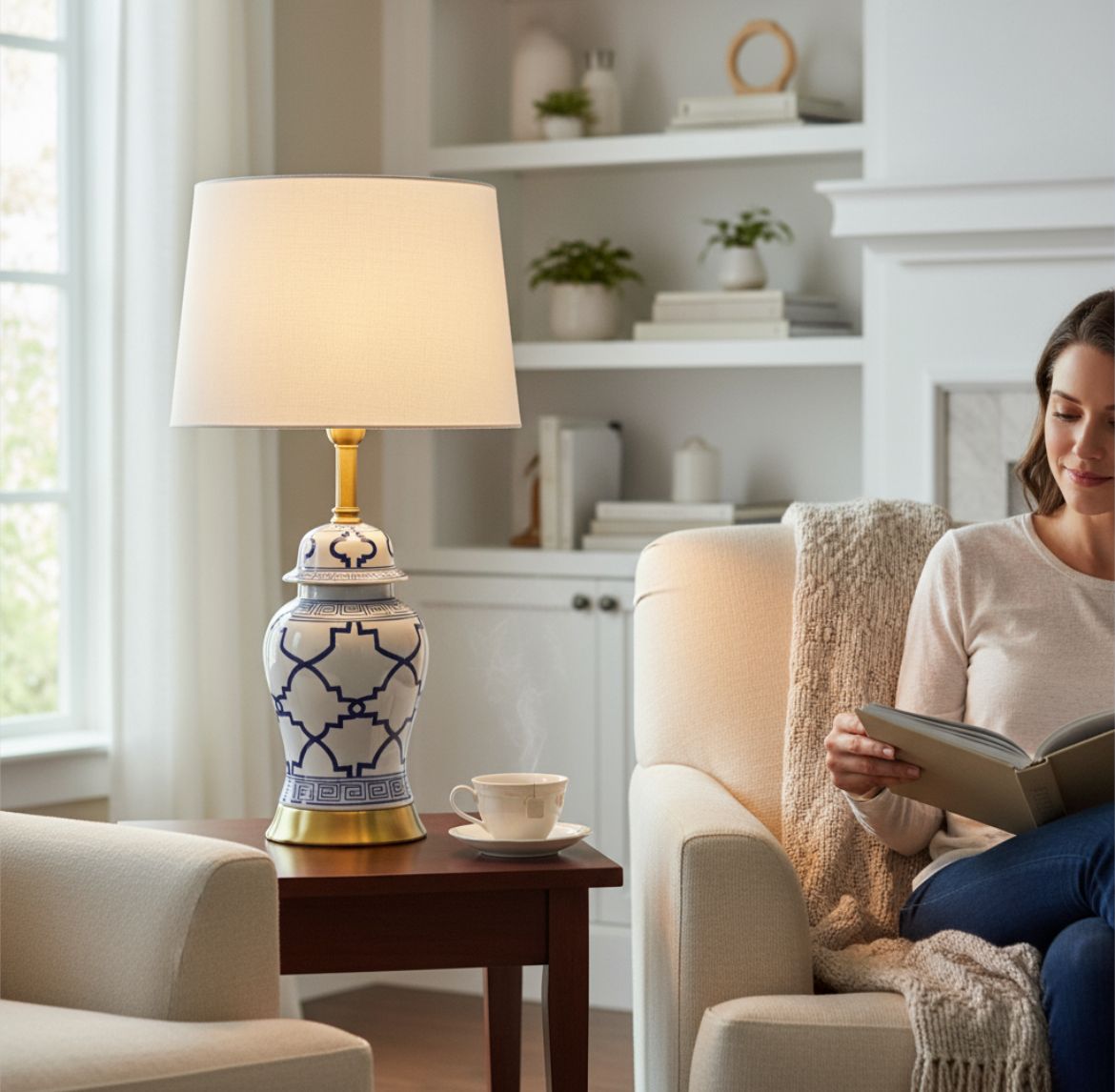 This elegant ceramic lamp base features a classic urn-shaped silhouette adorned with bold blue geometric patterns on a glossy white surface. The refined design is complemented by intricate detailing near the top and bottom, paired with polished brass trim for a touch of luxury. Perfect for interiors seeking a blend of timeless tradition and modern sophistication, this lamp base serves as both a decorative and functional centerpiece.