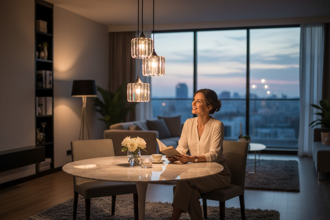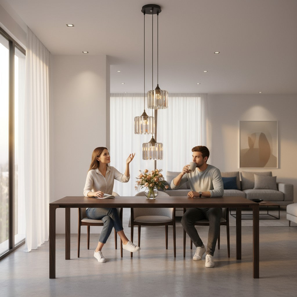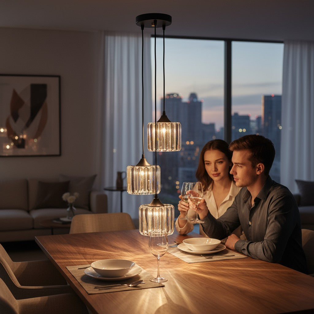 The Aurum Noir Crystal Cascade Pendant is a statement lighting fixture that merges modern geometry with luxurious detailing. Featuring a trio of smoke-tinted crystal shades suspended at varying heights, this chandelier diffuses light through precisely cut prisms, creating a warm, sophisticated glow. The sleek black and gold accents lend a contemporary yet timeless aesthetic, making it ideal for dining rooms, lounges, and upscale commercial interiors.