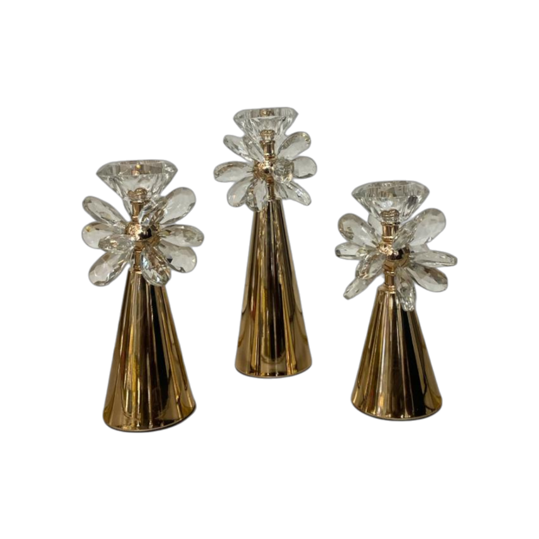 Illuminate your space with timeless elegance using the Aurora Crystal Bloom Candle Holders. Featuring delicately crafted crystal petals that capture and scatter light beautifully, these candle holders rest on sleek, gold-toned bases that exude luxury and sophistication. Perfect as a centerpiece or accent décor, each piece blends modern minimalism with classic charm—bringing a radiant glow to any table, mantel, or special occasion.