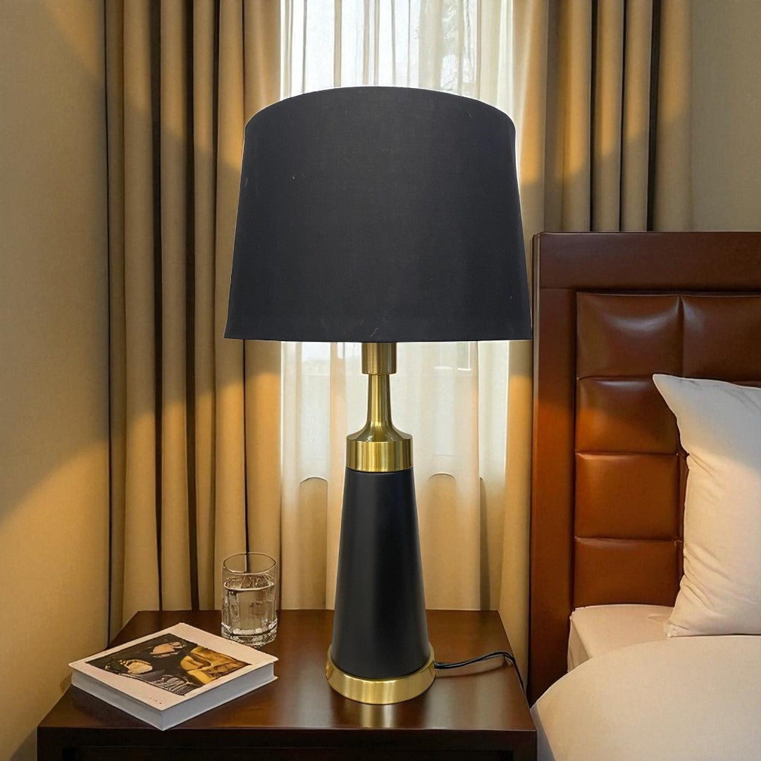 This sleek lamp base showcases a modern tapered cylindrical design in matte black, accented with polished gold detailing at the top, bottom, and stem connection. The contrast between the deep black body and gleaming gold elements creates a bold, luxurious look. With its clean lines and refined finish, this lamp base is a versatile piece that enhances both contemporary and classic interior styles.